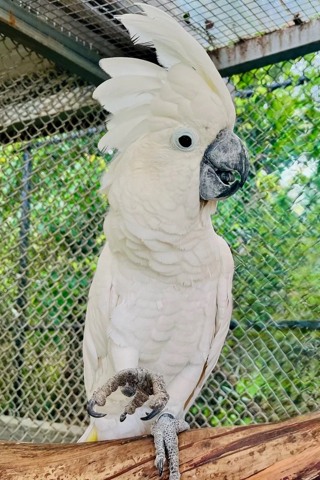 The Salmon-crested Cockatoo, also known as the Moluccan Cockatoo, is a large parrot native to the Maluku Islands in Indonesia. They are predominantly white with a distinctive salmon-pink wash on their crest, cheeks, and underwings. They have a prominent, expressive crest that they can raise or lower, which often signals their mood. Their strong, curved beaks are adapted for cracking nuts and seeds, and their zygodactyl feet allow them to grasp branches and manipulate food with dexterity. Salmon-crested Cockatoos are highly social and intelligent birds known for their loud calls and strong pair bonds. With voices reaching 129 decibels, they are some of the loudest birds in the world. In the wild, they often form large flocks and engage in playful activities, including vocal mimicry and tool use. Their social structure supports cooperative breeding, and they communicate extensively through vocalisations and body language. During breeding, pairs typically nest in large tree cavities, where the female lays 2 to 3 eggs. Incubation lasts about 25 to 28 days, and the female primarily incubates while the male provides food and protection. Chicks fledge approximately 10 to 12 weeks after hatching.