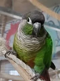 The Green-cheeked Conure is a small parrot known for its compact size and colorful yet subtle feather coat. It has a primarily green body, with a greyish head and breast, blue flight feathers, and a maroon tail. The cheeks are tinged green, giving the bird its name, and its eyes are surrounded by white bare skin. Despite their modest size, they are known for their playful energy and expressive appearance. Behaviorally, Green-cheeked Conures are social, curious, and intelligent birds that thrive in flocks and form strong pair bonds. They are active foragers, feeding on fruits, seeds, berries, and blossoms, and communicate with soft, high-pitched calls—less raucous than many other conure species. Breeding typically occurs during the warmer, wetter months. They nest in tree cavities, where the female lays 4 to 6 eggs, incubated for about 22 to 25 days. Both parents participate in raising the chicks, which fledge at around 7 to 8 weeks of age.
