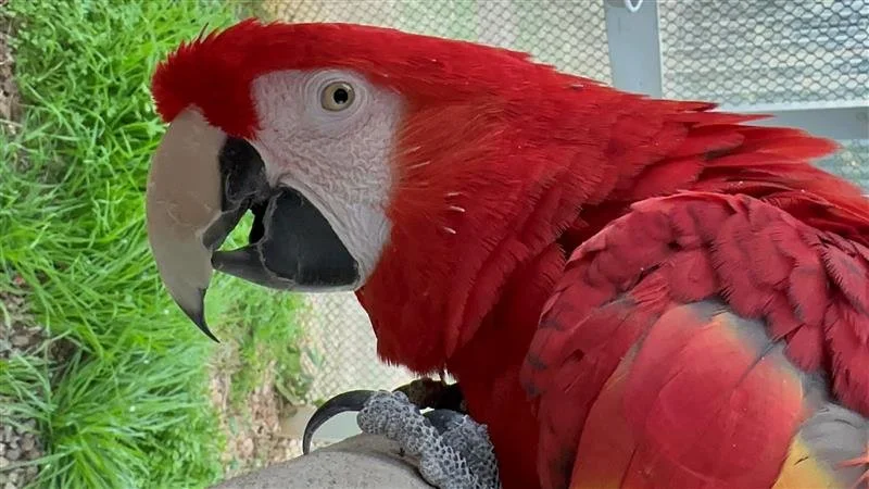 The Scarlet Macaw is one of the most vividly colored and recognizable parrot species in the world. It has predominantly bright red plumage across the head, shoulders, and chest, with yellow feathers on the mid-wing and blue on the lower wings and tail. Some individuals may also show hints of green on the wings. Its bare white facial skin is lined with small, dark feather lines, and it possesses a large, strong, pale upper beak and darker lower mandible. Scarlet Macaws are highly intelligent and social, often seen flying in pairs or small family groups, and sometimes larger flocks near communal roosting sites. They are known for their loud, raucous calls used to communicate across dense tropical forests. During breeding season, which varies by region but typically aligns with the dry season, monogamous pairs select tree cavities high in emergent trees. The female usually lays 1 to 4 eggs, incubating them for about 25 to 28 days, while the male helps by feeding her. Chicks fledge around 10 to 12 weeks after hatching and may remain dependent on their parents for several more months.